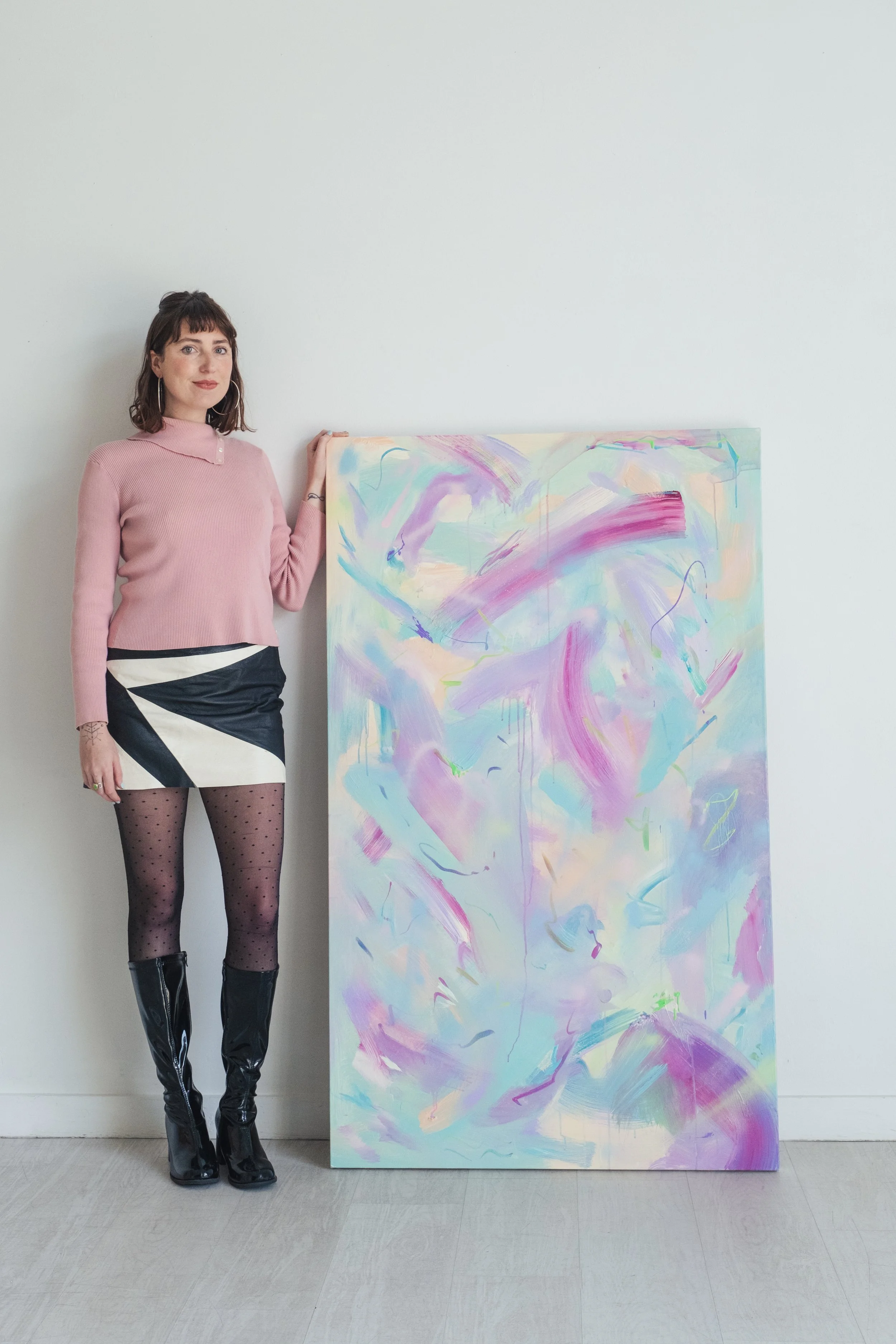 Like a yin yang, her work is rooted in natural duality. Working as a professional photographer light is her constant inspiration, and if you ask her what she is painting the answer is simple: light. Her painting process is intuitive, gestural, and acts as a form of color therapy. Her paintings evoke a sense of joy, wonder, and playful artistry. She is known for her distinctly dreamy color palettes as well as her boundary-less approach to creativity and inspiration. She mixes her colors on the canvas to reveal the unexpected. Like a keleidoscope, a stained glass window, or a prism that breaks up light into individual rainbows, the result is a view of natural beauty and inner worlds.